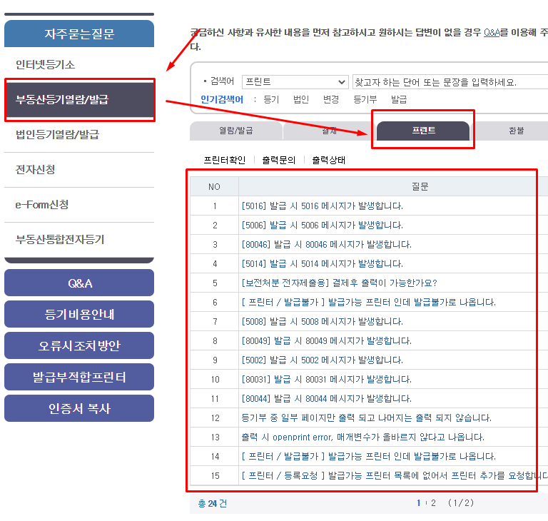 ์์ฃผ๋ฌป๋ ์ง๋ฌธ์์ '๋ถ๋์ฐ๋ฑ๊ธฐ์ด๋/๋ฐ๊ธ' ๋ฉ๋ด๋ฅผ ์ ํํฉ๋๋ค. ์ผ์ชฝ ํ๋ฉด ํญ๋ฉ๋ด ์ค 'ํ๋ฆฐํธ'๋ฅผ ์ ํํฉ๋๋ค. ํด๋น ๋ด์ฉ์์๋ ํ๋ฆฐํธ์ ๊ด๋ จ๋ ์ฌ๋๋ค์ ์ง๋ฌธ๋ค๊ณผ ๋ต๋ณ์ ํ์ธํ ์ ์์ต๋๋ค.